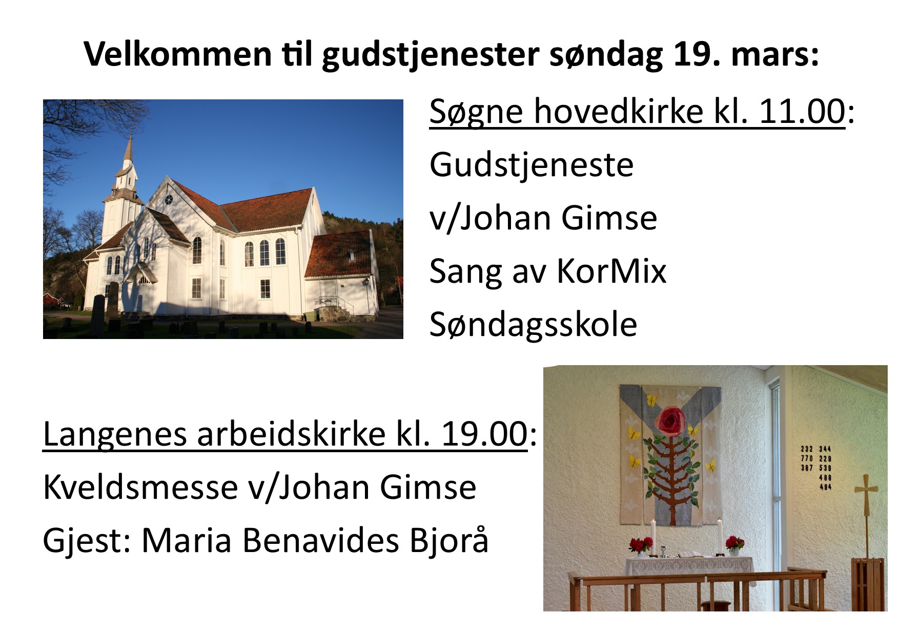 Søndag 19. mars. Kl. 11.00: gudstjeneste i Søgne hovedkirke hvor KorMix synger og det er søndagsskole. Offeret går til Den norske Israelsmisjon og det blir servert kirkekaffi. Kl. 19.00: kveldsmesse i Langenes arbeidskirke. Kveldens gjest er Maria Benavides Bjorå. Offeret går til Operasjon Mobolisering.
