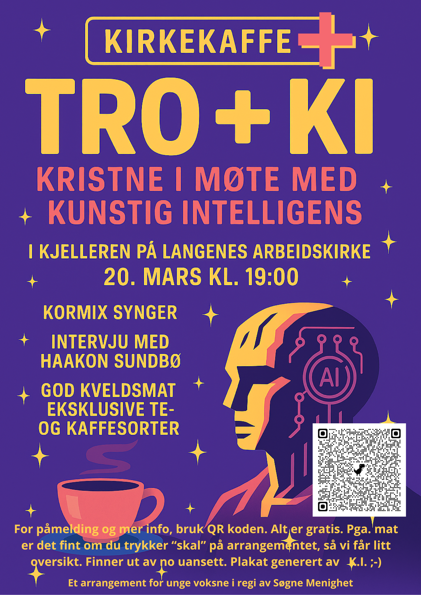 “Kirkekaffe+” er for unge voksne der vi vektlegger både det sosiale, men også spennende og aktuelle tema. På selve startskuddet for opplegget ønsker vi å snakke om KI. Vi ønsker å tenke sammen om hvordan kristne og kirka kan forholde seg til KI på best mulig måte. Vi skal derfor ha en samtale med Haakon Sundbø om tematikken.